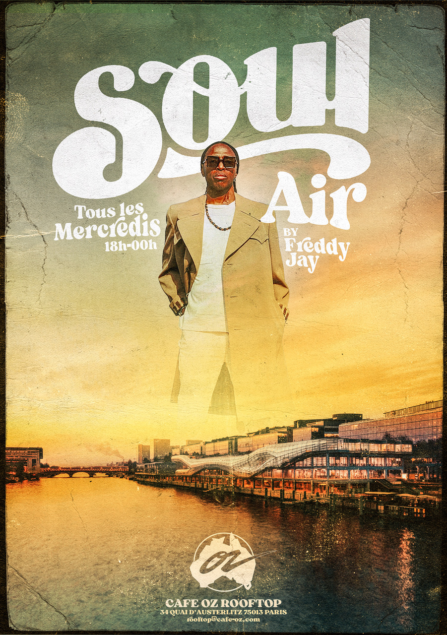 At summertime and summer you can find him every Wednesdays for « SOUL’ AIR by Freddy Jay », his new parisian residency, on the biggest Rooftop in France at Café Oz Rooftop, at the last level of « La cité de la mode ».